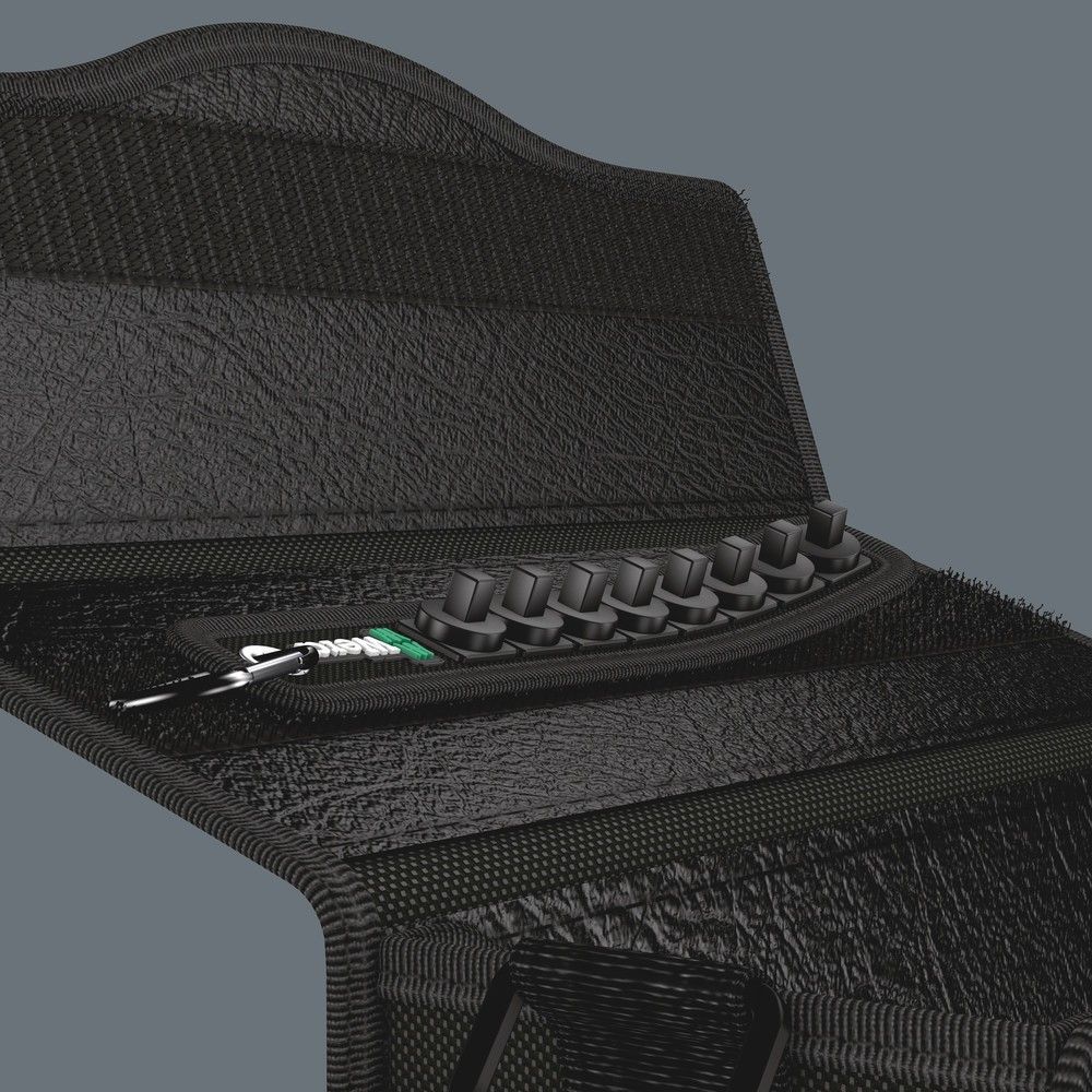 1 correa textil robusta, sin útiles. Para hasta 8 llaves de vaso y/o vasos de punta de arrastre de 1/4″. Incluye un mosquetón para la fijación en la trabilla del cinturón o en un bolso. Dispone de una superficie de fieltro en la parte posterior para sujetarla de forma fácil con ayuda de cintas autoadhesivas, por ejemplo, en la pared, la estantería, el carro de herramientas o el sistema de transporte de herramientas Wera 2go. El mecanismo de giro fácil y suave permite una sujeción segura así como una extracción muy sencilla de la herramienta.