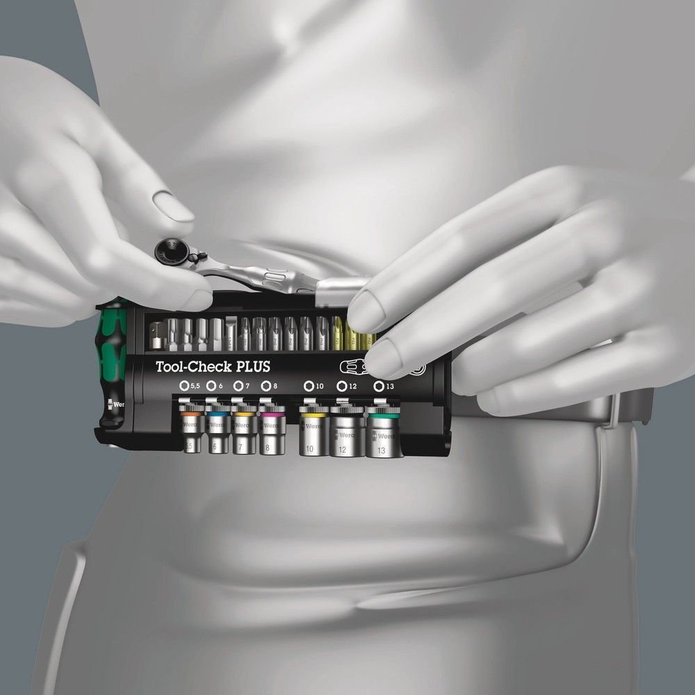 28 puntas, 7 vasos (de 1/4″), 1 porta-puntas Rapidaptor, 1 pieza de conexión 870/1 (de hexagonal de 1/4″ a cuadrado de 1/4″). 1 carraca de puntas Zyklop Mini 1 de Wera, versión de acero forjado mediante estampación; adecuado para puntas de arrastre de hexagonal exterior 1/4″ según DIN ISO 1173-C 6,3 y E 6,3 y series de conexión de Wera 1 y 4; por medio de la adaptación con el adaptador 870/1 también es posible utilizar vasos de 1/4″.