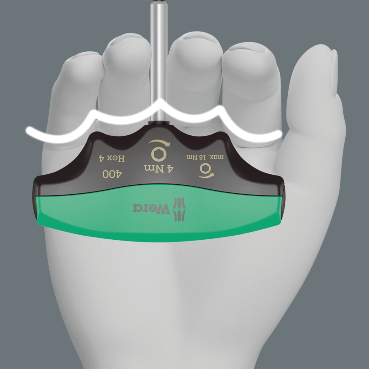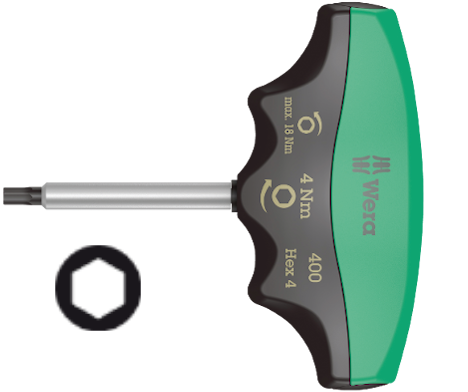 “Destorpar» Wera con valor de apriete fijo para tornillos de hexágono interior. Protegido contra manipulaciones. El robusto acoplamiento a fricción emite una señal de salto claramente audible y palpable cuando se alcanza el par de giro preajustado. Ahora, exceder el apriete más allá del par ajustado ya no es posible. El par de aflojado es siempre mayor que el par de apriete ajustado. De esta forma, en la mayoría de los casos no se necesitan otras herramientas adicionales para aflojar uniones atornilladas. La forma del mango de esta herramienta ocupa completamente toda la mano, y los dedos se alojan suavemente dentro de las molduras redondeadas. De esta forma se garantiza una transmisión de la fuerza óptima y de forma ergonómica.