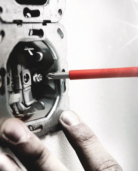 Destornillador VDE de Wera con un mango multicomponente tipo Kraftform Plus para un trabajo rápido y ergonómico: las zonas druras del agarre proporcionan una alta velocidad en el trabajo mientras que las zonas blandas del mango garantizan una alta velocidad de transmisión de los pares de giro. Dispone de un perfil combinado de ranura y Pozidriv* ante todo adecuado para trabajos en bornes eléctricos en línea, en armarios para fusibles, en conmutadores así como en relés. Han sido probados pieza por pieza en un baño de agua bajo una tensión de 10.000 voltios para asegurar un trabajo seguro bajo la tensión permitida de 1.000 voltios. El sistema de protección contra el rodamiento mediante un hexágono evita las molestias que puede causar el hecho de que el útil se ruede del lugar del trabajo.