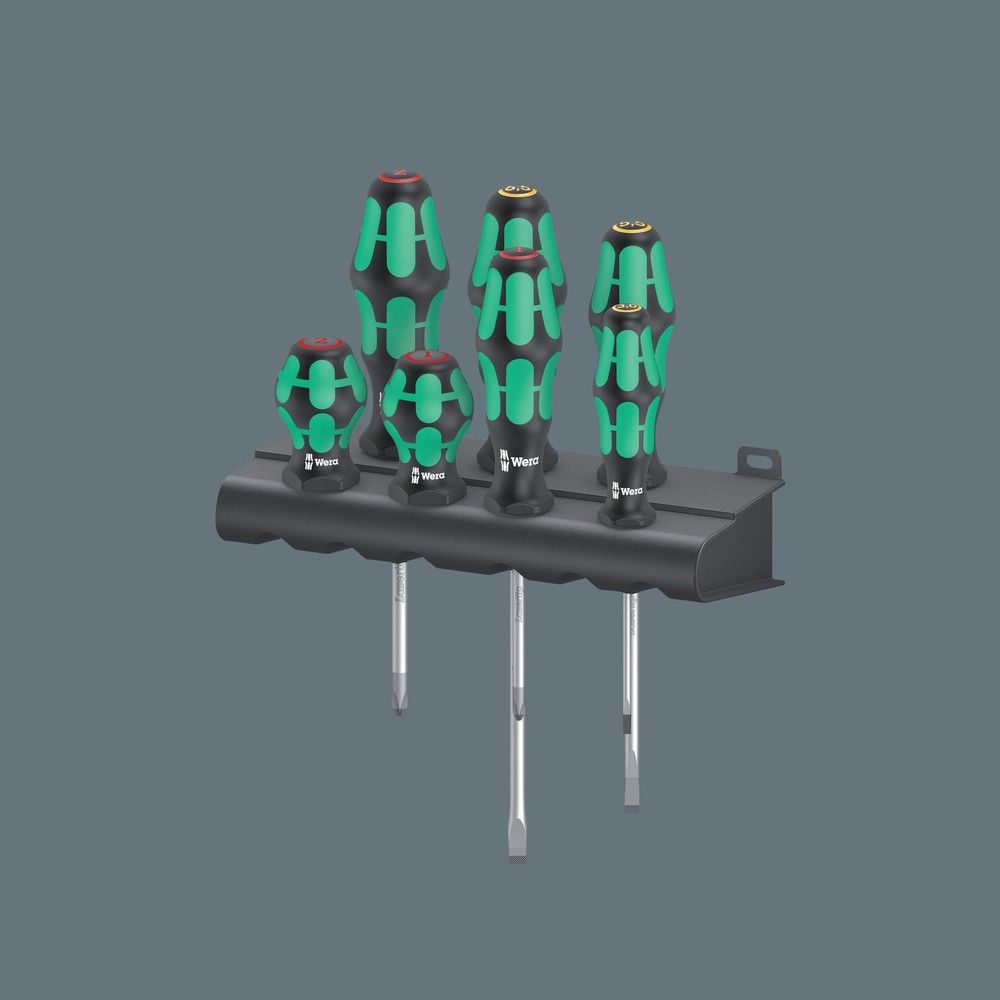 Una mezcla muy útil para el usuario que se compone de destornilladores para el taller con una varilla de un largo normal y destornilladores tipo Stubby especialmente pequeños con una varilla corta para áreas difícilmente accesibles. El mango tipo Kraftform bicomponente dispone de una combinación práctica de zonas duras y zonas blandas y permite así un agarre fijo y un trabajo preciso. Las varillas incluyen todas las ventajas de la tecnología de puntas de Wera. A las varillas se les ha dado un tratamiento de superficie especial para lograr una alta protección anticorrosiva y una gran exactitud de posicionamiento dentro del tornillo. El sistema de protección contra el rodamiento mediante un hexágono evita las molestias que puede causar el hecho de que la herramienta se ruede del puesto de trabajo.