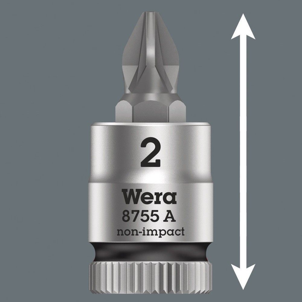 Realización:Para la aplicación manual y a máquina (no de impacto), con ranura para retener un pasador, con moleteado en la parte posterior para mayor adherencia en la utilización manual; los vasos de punta llevan las ventajas de la tecnología Wera, en cromado mate. Con señalización del perfil a color (negro = Pozidriv) y el marcado del tamaño para encontrar el vaso de punta deseado más fácilmente